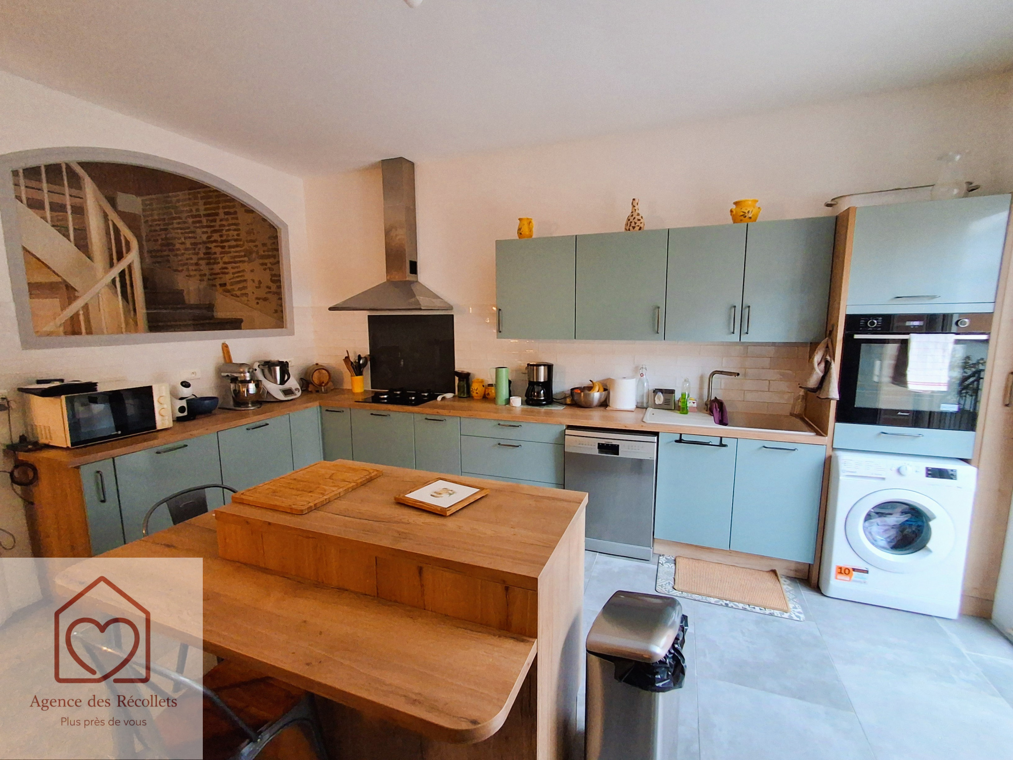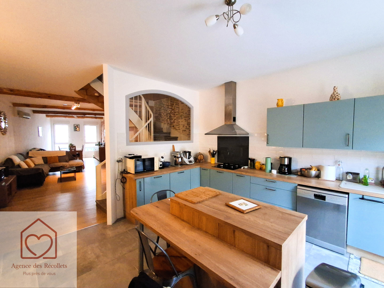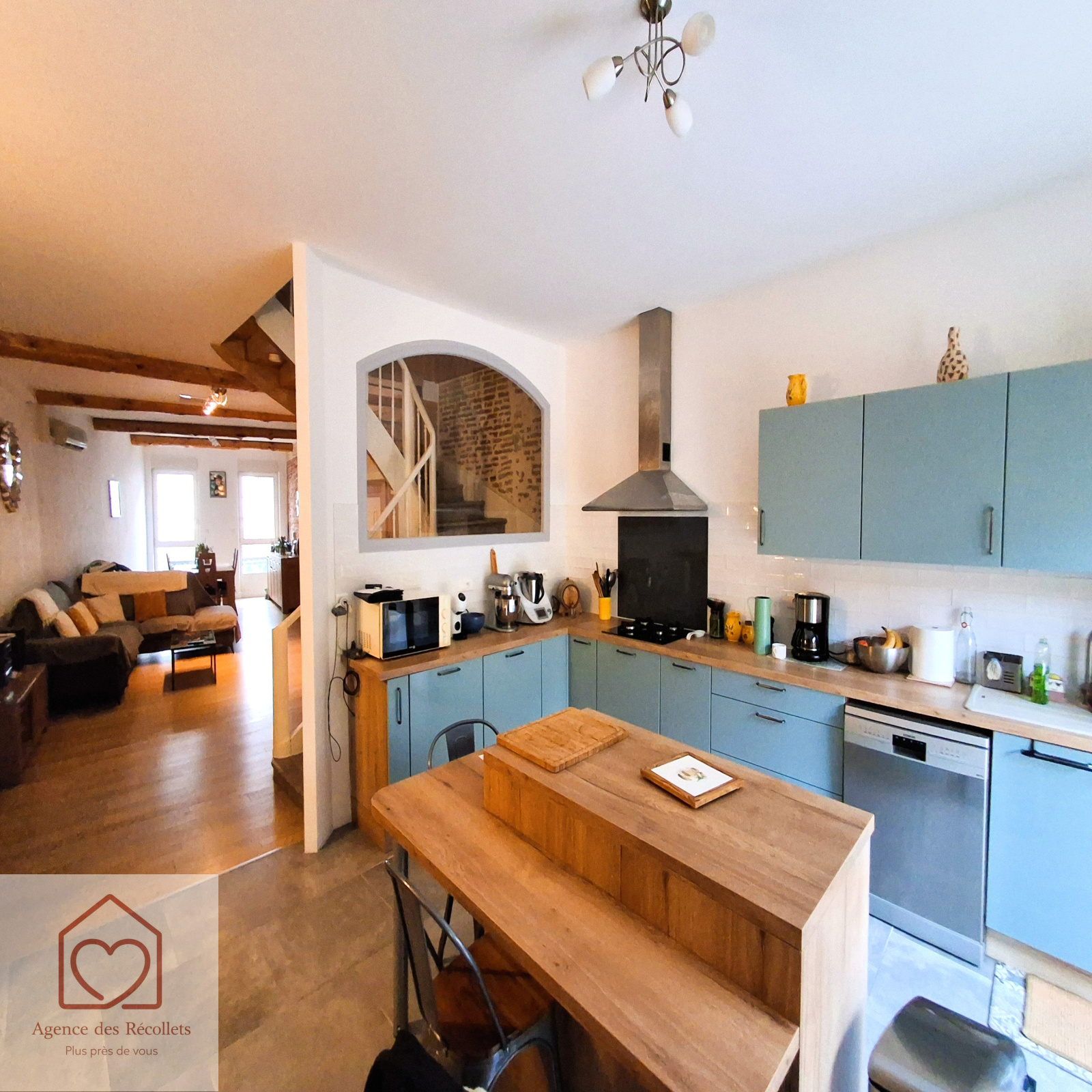 Maison de ville entièrement rénovée, offrant une grande pièce de vie traversante avec cuisine ouverte sur salon.